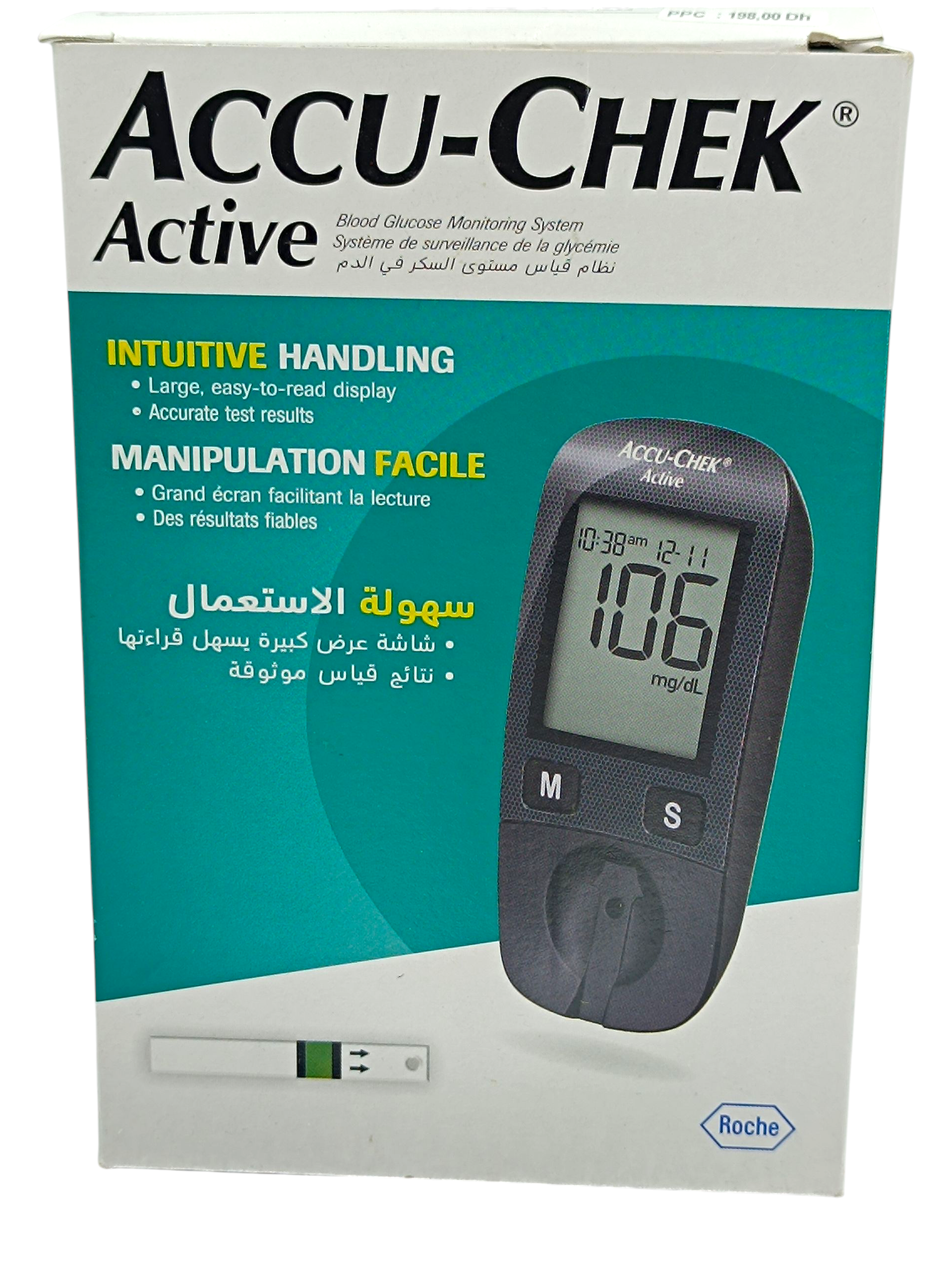 Le lecteur Active renferme plusieurs caractéristiques puissantes dans une taille plus petite que la version précédente. Consultez les moyennes des résultats des tests jusqu'à 90 jours, recevez des alertes si vos bandelettes de test sont périmées ou si vous avez sous-dosé, dosez à nouveau au bout de 10 secondes, fixez des rappels de tests pré- et post-prandiaux, et plus avec l'Accu-chek active kit.